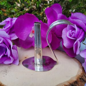 Delightful silver bud vase made from a lacquered silver spoon, whimsical and water-tight. Handmade by Craig Fowler of Craig’s Creations.