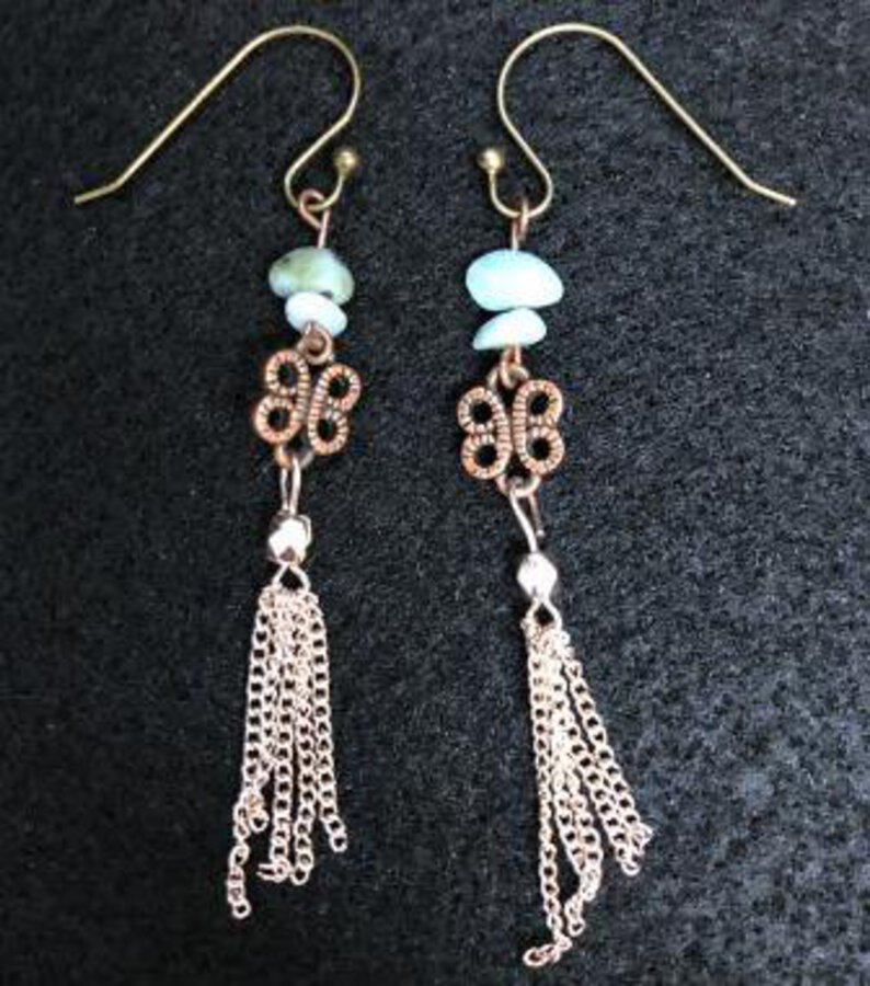 Shimmering little chains dangle from cloverleaves topped with turquoise beads. Minimal elegance in bead work and metal charm earrings. Created by Stacy Bowles of Moonstone Muse Studio.