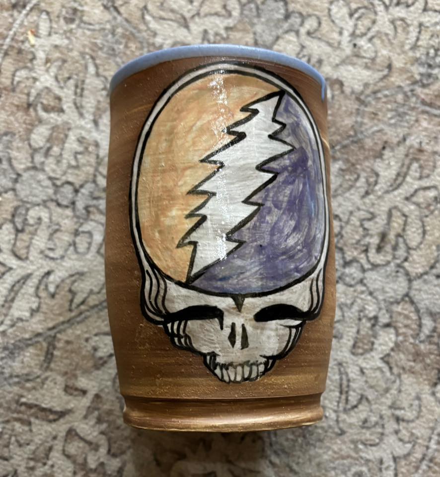 This tumbler is crafted from hand-gathered and recycled clay, wheel-turned by Spencer Dofflemyer of NPC. Design, and glazed with a striking periwinkle inside, and hand-painted glaze featuring the logo of the legendary Grateful Dead Band.