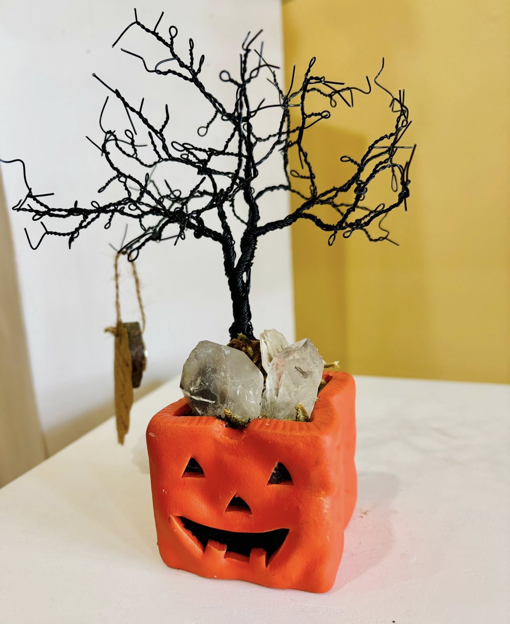 Feeling a little spooky? This black metal twisted into a bare tree is handmade whimsy with Halloween vibes. Nestled into a thrifted jack-o-latern base, eerie phantom quartz stones thrust out of the roots like tombstones. Crafted by moonlight by Krista Vega of Kitty’s Creations.