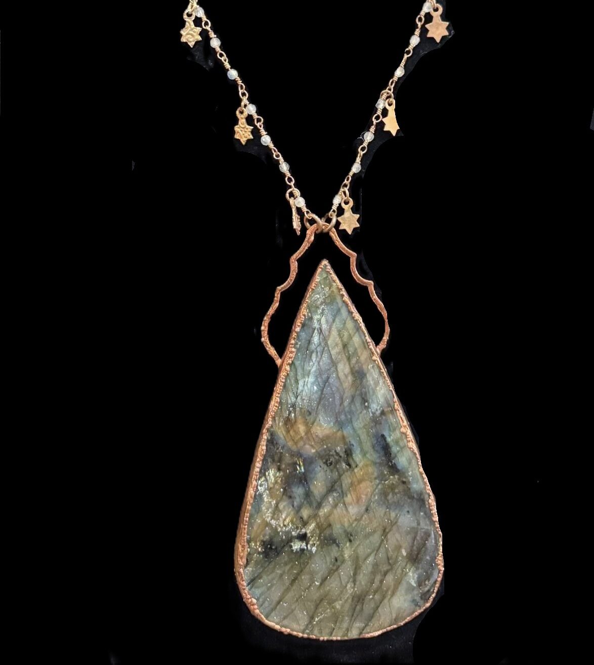 The huge graceful slice of labradorite forming the pendant of this necklace will stop traffic. The colors in the stone are spectacular, and perfectly set off by an electroformed chain adorned with tiny stars. This statement piece was made by Rebecca Burrell, creator and artistic talent of Minxes Trinkets.