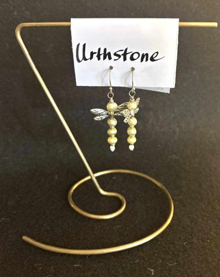Pale green pearls and pewter wings make up these winsome little dragonflies, dangling 1.5″ from fishhook wires. Created by Chris Willems of Urthstone. USC 1146.