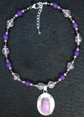 Necklace of purple and clear crystals with pendant of unusual purple turquoise, handmade by Debbie Dunnigan. Debbie Dunnigan has a passion for rescuing animals. She donates $5 from every purchase of her jewelry to local shelters. Every time she receives a check she sends us a receipt to verify that she has made a contribution to help support her cause.