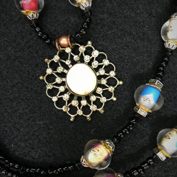 Tiny faceted jade beads create a rainbow trail that ends in a pewter hamsa, dangling 3″ from fishhook wires. Created by Chris Willems of Urthstone. USC 1169.