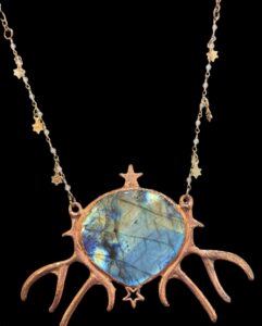 Rebecca Burrell, creator and artistic talent of Minxes Trinkets, manifested this spectacular necklace by taking this stunning slice of labradorite and wrapping it in electroformed copper tendrils, added some copper stars and a star-embellished copper chain, et voila! A pendant that is equally glorious no matter which side faces out.