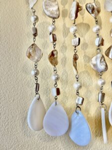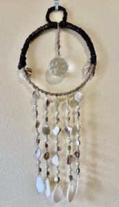 Bright ocean energy thrums from this beachy suncatcher, its delicate seashells and pearls dancing from a center ring of twine and brown raffia, with a big Swarovski crystal flashing from the center. Created by Layla of Phoenix Engravings.