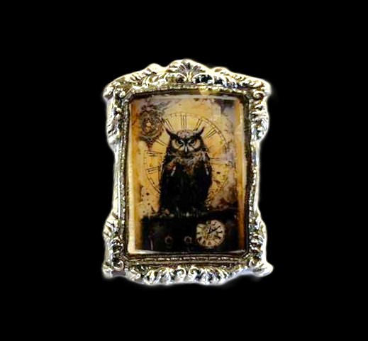 Tiny art to decorate your favorite space! This time-conscious owl is very serious about punctuality. He is protected under acrylic and framed in silver, with a tiny easel for display! This entire miniature art piece is under 3 inches. Crafted by Michelle Arsenault of Michelle Ink Designs is known for. MID 9082