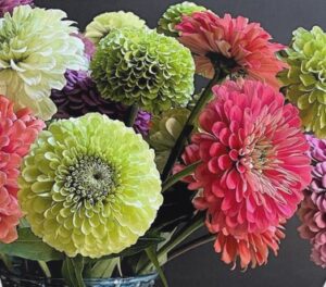 Fat floofy marigolds and zinnias, posing blissfully in the summer sun. Beautiful floral photography printed onto crisp canvas, removing the barrier of glass so the viewer can get in there and suss out all the subtle details. This original photo was captured and edited by Carolyn Seibert-Drager of The Farmer’s Daughter’s Flowers.