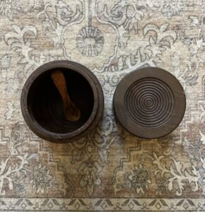 Functional and pretty, this piece has it all! Handmade walnut salt cellar by local artist Steve Ramsey of Carve’ Diem is 5.25 inches tall and 3.25 inches wide. The outside of the piece is carved in intricate detail, with lid and wee wooden salt spoon. Polished with food-safe mineral oil.